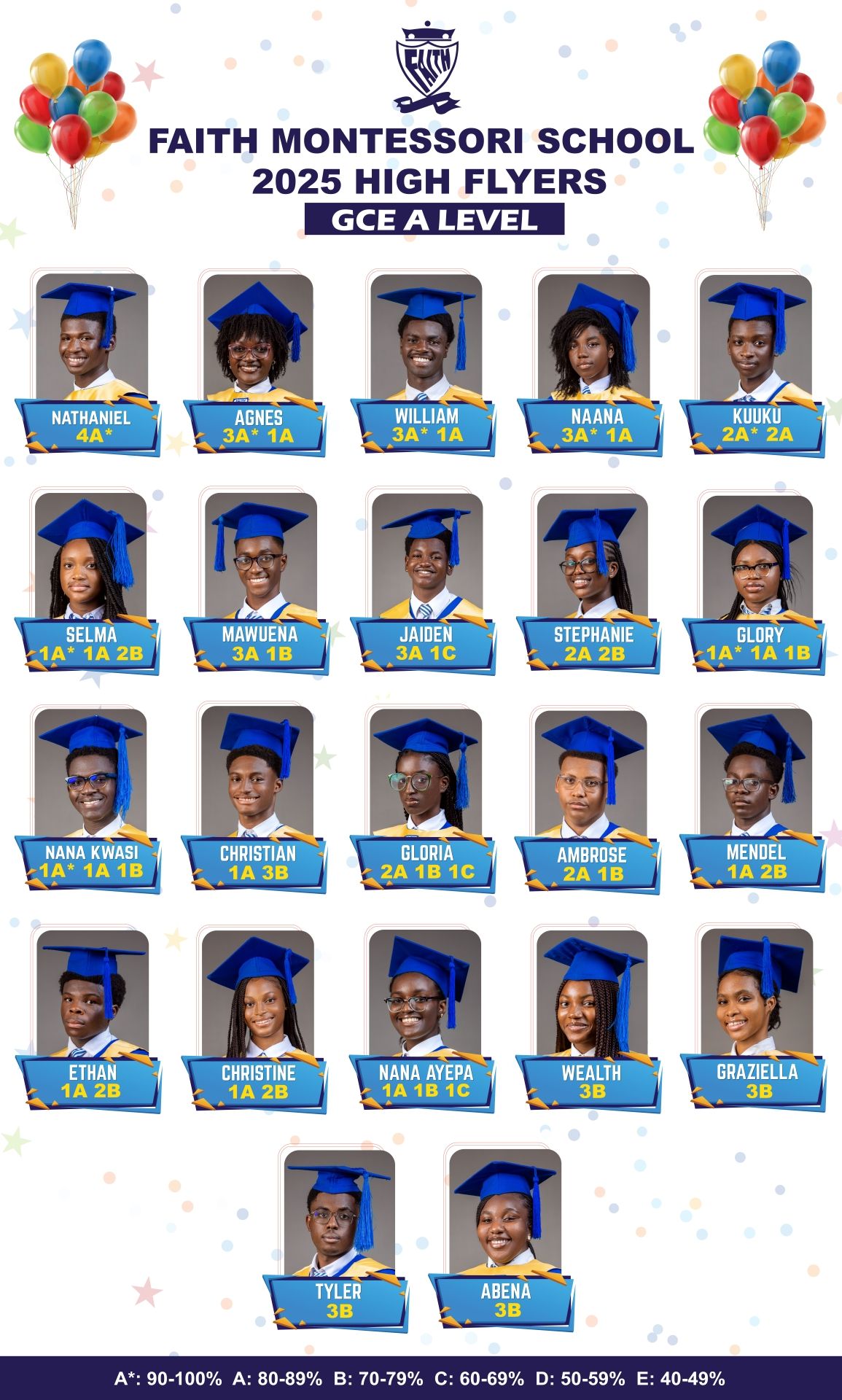Faith Montessori School Directors and Teaching Staff send their congratulations to the Upper Six students on their achievements in 2025. We continue to cater for internal and external students at Sixth Form level and are proud of the success all our students have achieved this year, across a broad range of A level subjects.